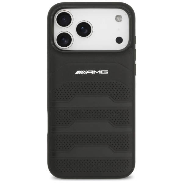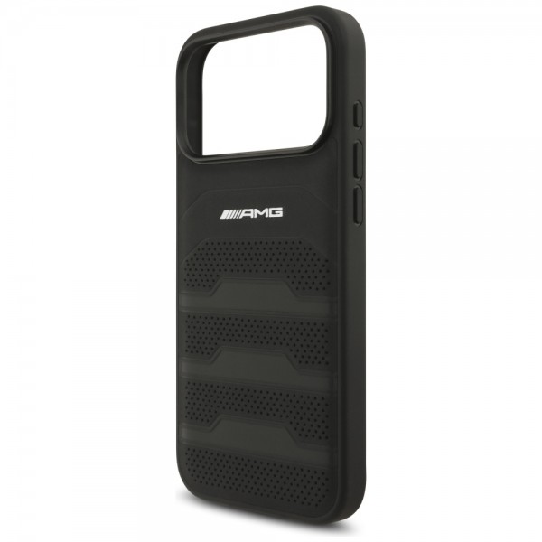 AMG Mercedes iPhone 17 Pro Max Hülle Case Echtleder Debossed Schwarz. Die Kollektion wurde ausschließlich aus hochwertigsten Materialien kreiert – ein klarer Verweis auf die Charakteristika der Marke AMG, die für höchste Qualität und präzise, nahezu perfekte Verarbeitung ihrer Produkte bekannt ist. Die Rückseitenschale besteht aus starkem Polyurethan, was die Schlagfestigkeit erhöht und das Telefon vor möglichen Beschädigungen schützt. Die flexiblen Seiten haften gut am Telefon, sodass Sie das Telefon fest in der Hand halten können. Die Außenschicht des Bezugs ist mit hochwertigem Leder bezogen, das mit verschiedenen Texturen verziert ist – einer Kombination aus glattem, geprägtem und perforiertem Leder – diese Kombination verleiht ihm ein elegantes und modisches Aussehen.