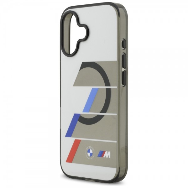 Die Rückseite ziert ein unverwechselbares BMW M Motiv – ein geometrisches Design mit halbtransparenten Streifen in den M Farben (Blau, Marineblau und Rot) und dem BMW M Logo, das die Authentizität des Produkts unterstreicht.