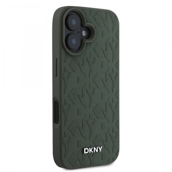 DKNY iPhone 16 Magsafe Hülle Case Leather Grid Grün. Die DKNY PU-Leder-Gittermuster Magsafe Schutzhülle besteht aus einem sich wiederholenden „DKNY“-Logo, das einen eleganten grafischen Effekt erzeugt.