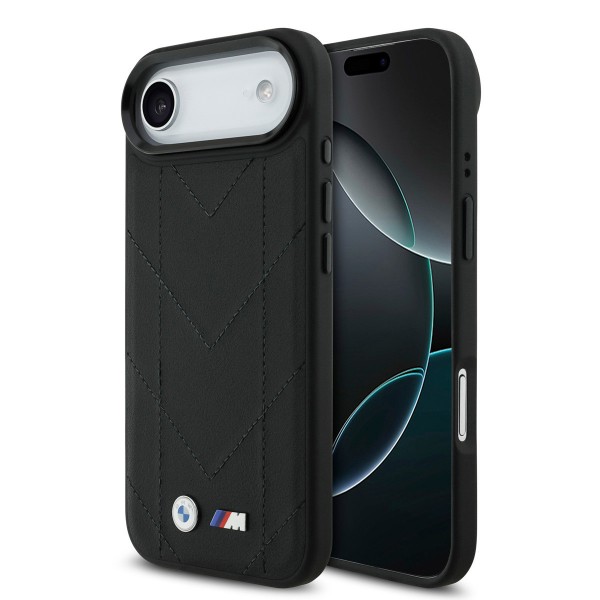 BMW iPhone 17 Air Case Quilted M Logo MagSafe Black. Robust construction and a perfect fit. This collection's case is covered with eco-leather, ensuring a secure fit and increasing resistance to drops and mechanical damage. The back of the case is reinforced with polycarbonate, which protects the device from scratches and provides additional padding. Slightly raised edges around the display and camera lens protect the phone from scratches, while the flexible, soft sides allow for quick and easy installation. The cases feature all the necessary cutouts for ports and integrated button covers.