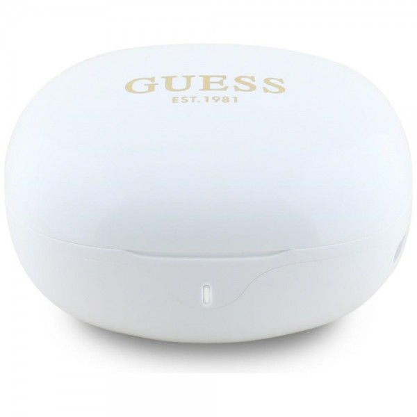 The white color gives the earbuds a unique and minimalist look. The gold Guess logo on the case adds a luxurious touch.