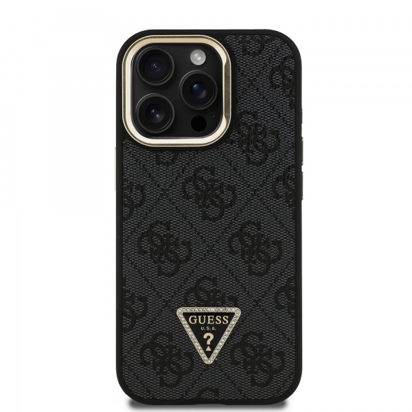 Guess iPhone 15 Pro Case Stand Camera MagSafe Rhinestone Logo Black. The premium "Guess PU 4G Rhinestone Triangle Logo Stand Camera Frame" back cover impresses with an elegant, signature 4G pattern, complemented by the GUESS triangle logo with rhinestone crystals.