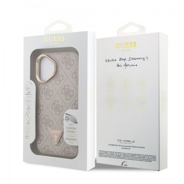 Guess iPhone 16 Case Stand Camera MagSafe Rhinestone Logo Pink. The premium "Guess PU 4G Rhinestone Triangle Logo Stand Camera Frame" back cover impresses with an elegant, signature 4G pattern, complemented by the GUESS triangle logo with rhinestone crystals.