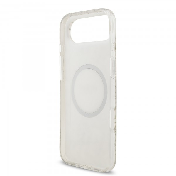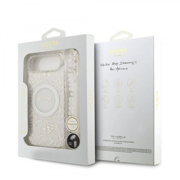 Guess iPhone 17 Air Case with MagSafe Flowers Strap White. The Guess IML Allover Pearl Strap MagSafe back cover for the phone is a great accessory for those who value style and functionality.