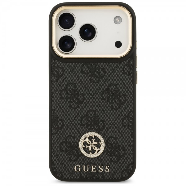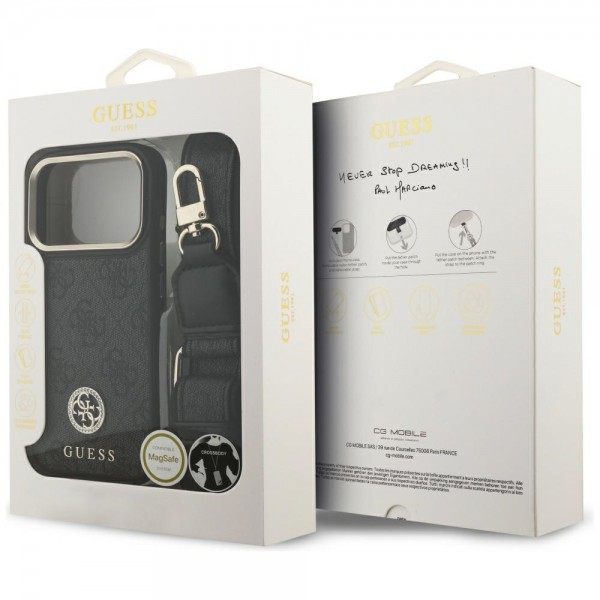 Guess iPhone 17 Pro Crossbody Case MagSafe 4G Rhinestone Metal Buttons Black. Unique look and exceptional quality. This exclusive protective case from the renowned Guess brand combines elegance and premium style. The case is covered in high-quality eco-leather with a printed, iconic 4G pattern. A 4G emblem and the Guess logo are located on the bottom, subtly underscoring the prestige of this case.