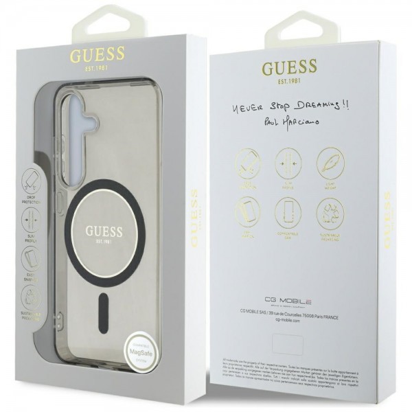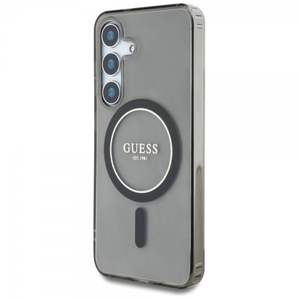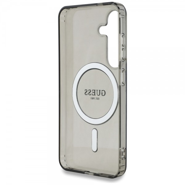 Guess Samsung S25 Case MagSafe Glitter Circle Black. Glitter Circle Classic Logo MagSafe is an exclusive line of protective cases that combines both exceptional functionality and stylish, unique design. This collection was created for people who value not only the security of their phone, but also an elegant appearance.