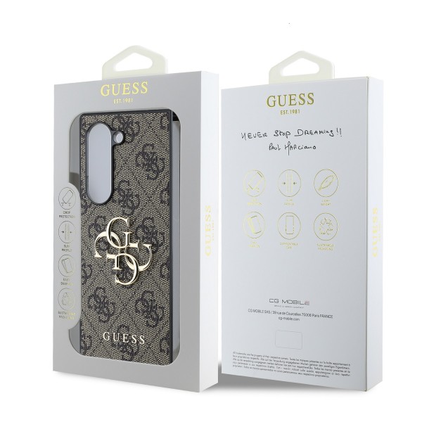 Guess Samsung Z Fold 6 Case 4G Logo Big Metal Brown. The high-quality Guess PU 4G Metal Logo back cover impresses with an elegant, signature 4G pattern, complemented by the GUESS logo.