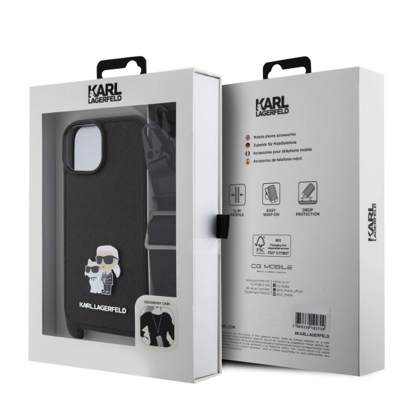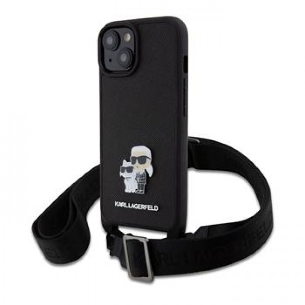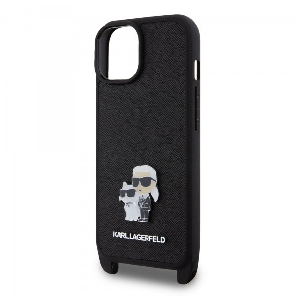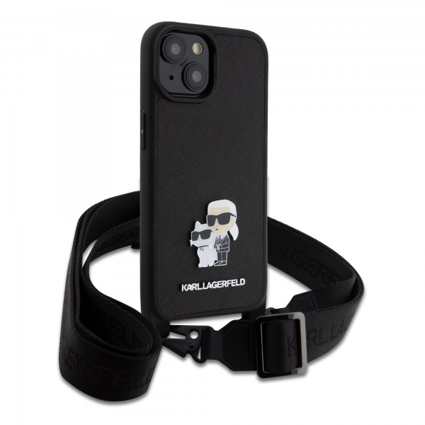 Karl Lagerfeld iPhone 15 Case Crossbody Karl + Choupette Black. With the high-quality Karl Lagerfeld Saffiano Crossbody Strap Karl and Choupette Cover, you not only get elegant protection for your smartphone, but also a practical shoulder strap and wallet for your credit cards or documents.