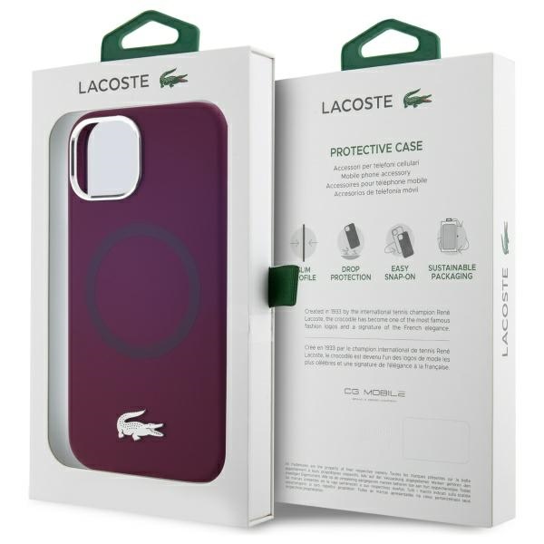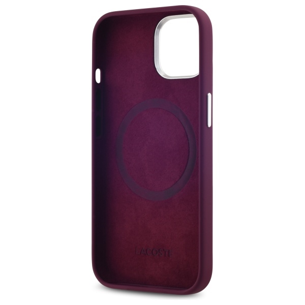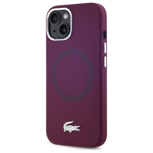Lacoste iPhone 15 Case, Silicone with Metal Croc, MagSafe, Bordeaux Red. This collection features a silver metal Lacoste logo and a silver frame around the camera and buttons. The minimalist silicone microfiber MagSafe case with the metal crocodile logo is a unique series with an unparalleled and stylish design. It's the ideal choice for all owners of devices with MagSafe technology. This latest collection of protective cases impresses with its unique design and outstanding functionality, guaranteeing reliable protection for your valuable device.
