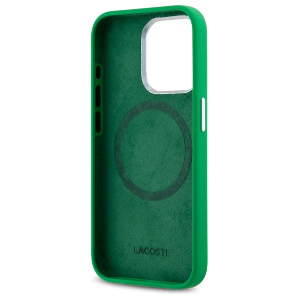 Lacoste iPhone 15 Pro Max Case, Silicone, Metal Croc, MagSafe, Green. This collection features a silver metal Lacoste logo and a silver frame around the camera and buttons. The minimalist silicone microfiber MagSafe case with the metal crocodile logo is a unique series with an unparalleled and stylish design. It's the ideal choice for all owners of devices with MagSafe technology. This latest collection of protective cases impresses with its unique design and outstanding functionality, guaranteeing reliable protection for your valuable device.