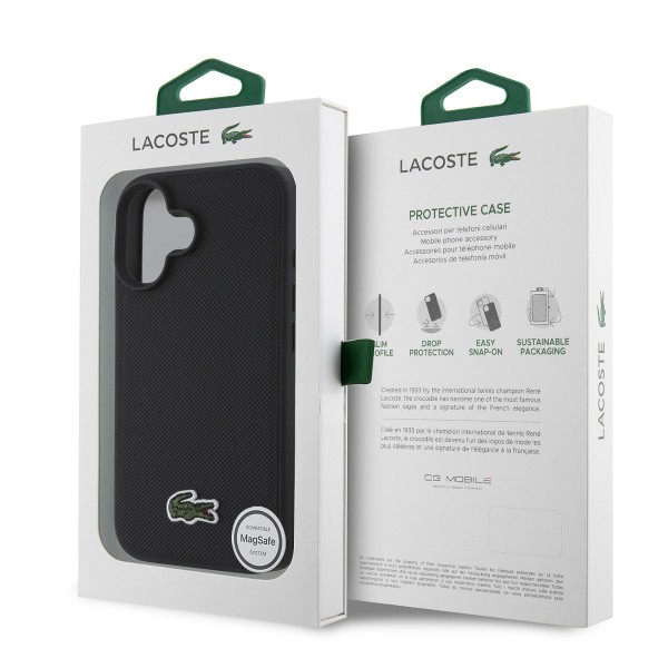 Lacoste iPhone 16 Plus Case MagSafe Iconic Petit Pique Woven Black. The Lacoste Iconic Petit Pique Woven Logo MagSafe back cover is the perfect accessory for your smartphone and outfit, combining functionality and style.