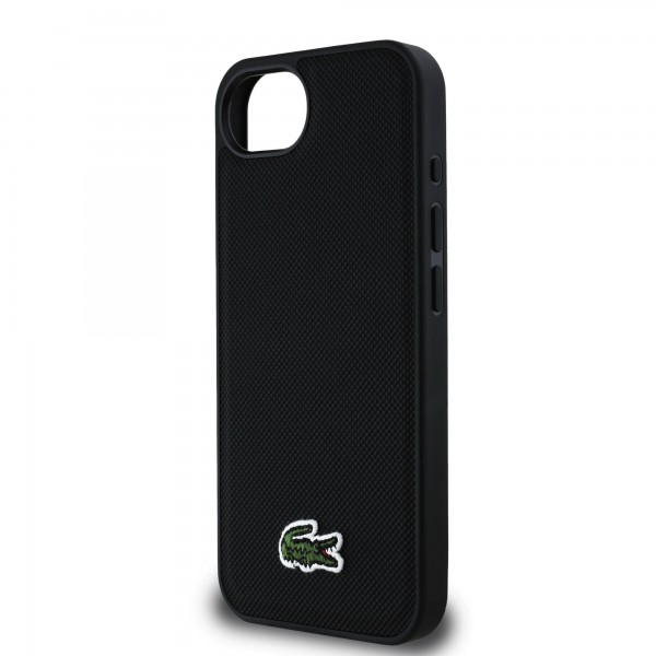 Lacoste iPhone 16e Case MagSafe Iconic Petit Pique Woven Black. The Lacoste Iconic Petit Pique Woven Logo MagSafe back cover is the perfect accessory for your smartphone and outfit, combining functionality and style.