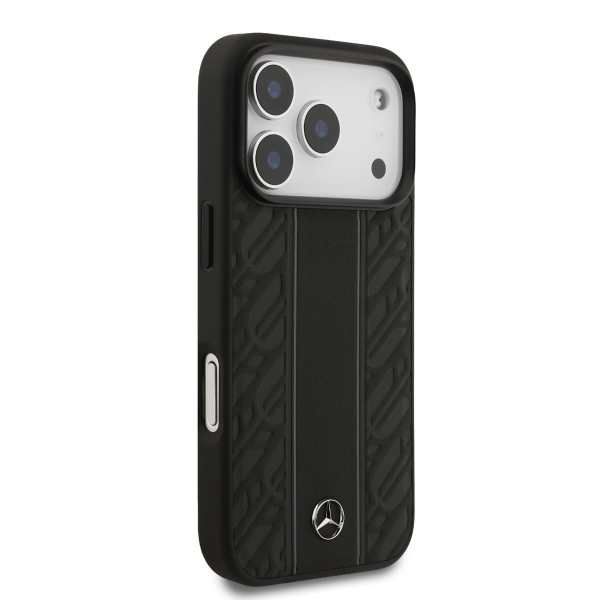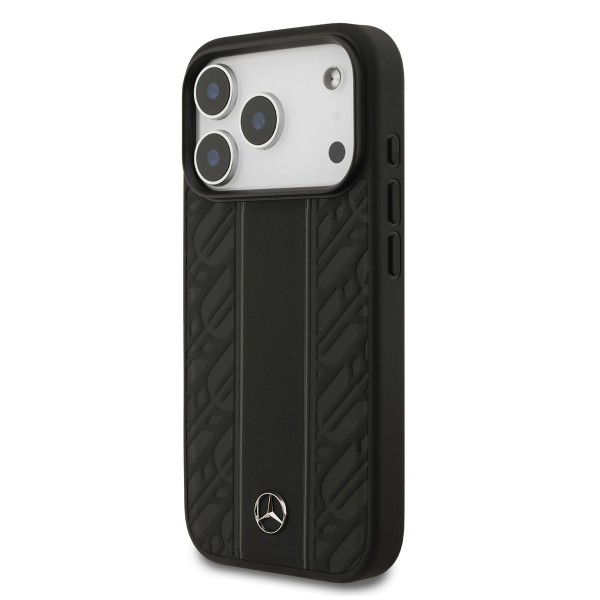 Mercedes iPhone 17 Pro Genuine Leather Case Laurel MagSafe Black. The protective cases in the Leather Laurel Leaves Stripes MagSafe collection are made exclusively from the highest quality materials. The case is made of durable polycarbonate covered with soft genuine leather – the polycarbonate protects against scratches and bumps, while the leather ensures a secure fit.