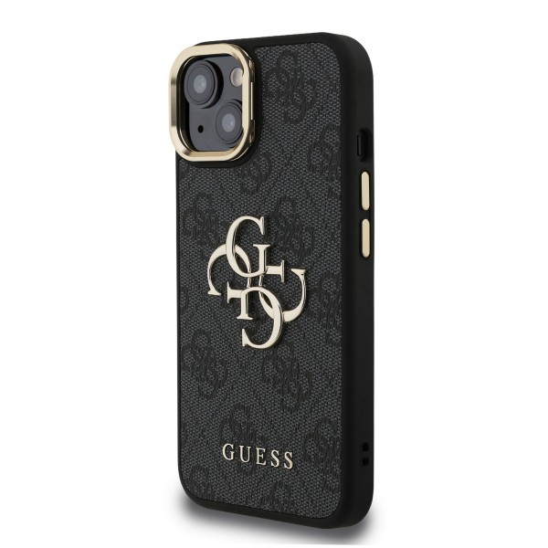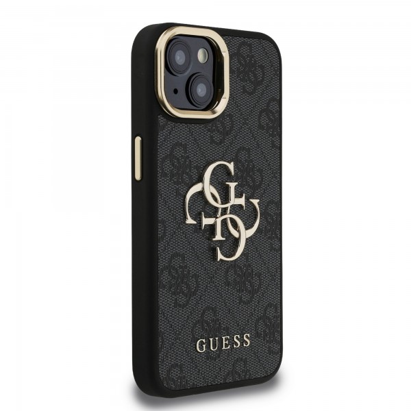 Guess iPhone 13 Hülle Case Metal Stand Camera Frame 4G Schwarz. Das Guess P4G Logo Stand Camera Frame Backcover ist das perfekte Accessoire für Ihr iPhone und Ihr Outfit und vereint Funktionalität und Stil. Dekorative Elemente dieser Hülle sind integrierte Tastenabdeckungen und ein Rahmen um die Kameralinse in der gleichen goldenen Farbe – diese einzigartige Kombination macht die Hülle nicht nur sehr elegant, sondern auch äußerst modisch. Die Innenseite der Hüllen ist mit einer weichen Mikrofaser ausgekleidet, die das Gerät stabilisiert und für Sicherheit gegen versehentliches Verrutschen sorgt. Eine stilvolle und elegante Hülle aus langlebigen, hochwertigen Materialien ist ein Produkt für Menschen, die nicht nur ein elegantes Aussehen, sondern auch den Schutz ihres Telefons schätzen. Das hochwertige Guess PU 4G Metal Logo Stand Camera Frame Backcover besticht durch ein elegantes, charakteristisches 4G-Muster, ergänzt durch das GUESS-Logo.