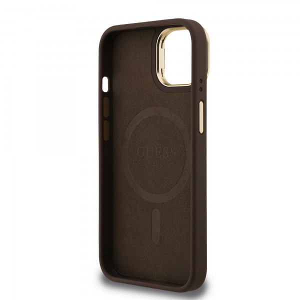 Schnellsuche Guess iPhone 15 Hülle Case MagSafe Strass Triangle Logo Stand Camera Braun