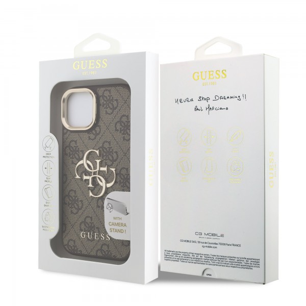 Guess iPhone 15 Hülle Case Metal Stand Camera Frame 4G Braun