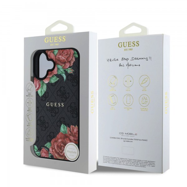 Guess iPhone 16 Hülle Case Leather MagSafe 4G Rosen Schwarz. Die Guess PU Leather 4G Roses MagSafe-Rückseite ist das perfekte Accessoire für Ihr Telefon und Ihr Outfit und vereint Funktionalität und Stil in einem.
