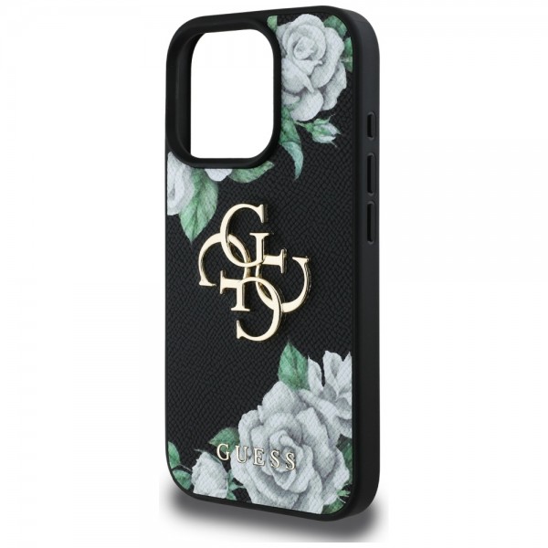 Guess iPhone 16 Pro Hülle Case Grained Roses Big 4G Logo Schwarz