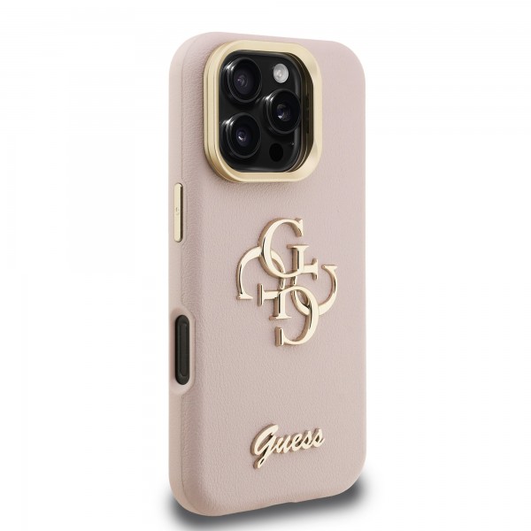 Guess iPhone 16 Pro Max Hülle Case Grained 4G Logo Stand Camera Frame Rosa