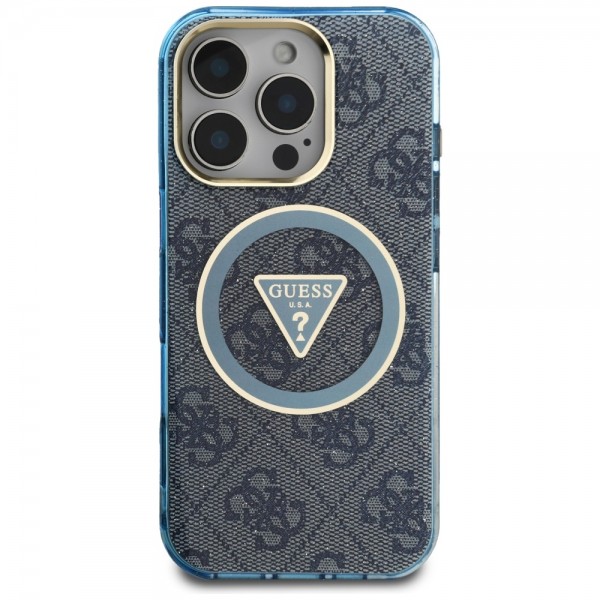Guess iPhone 16 Pro Max Hülle Case Metal Glitter 4G Circle MagSafe Blau