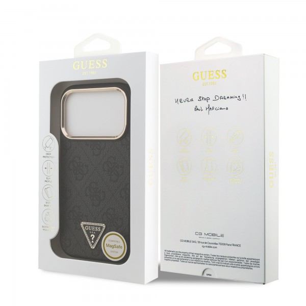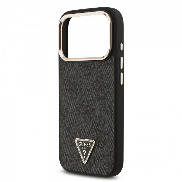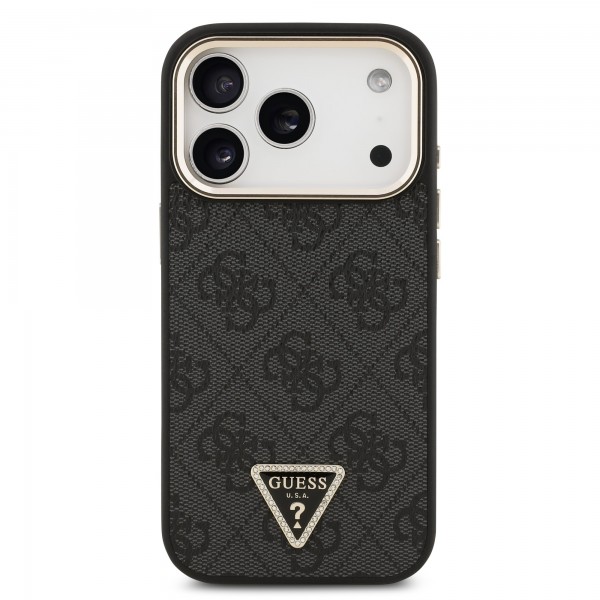 Guess iPhone 17 Pro Hülle Case 4G Strass Gold Frame MagSafe Schwarz. Das Guess PU-Leder 4G Triangle Logo Gold Frame Backcover ist das perfekte Accessoire für Ihr Smartphone und Ihr Outfit und vereint Funktionalität und Stil.