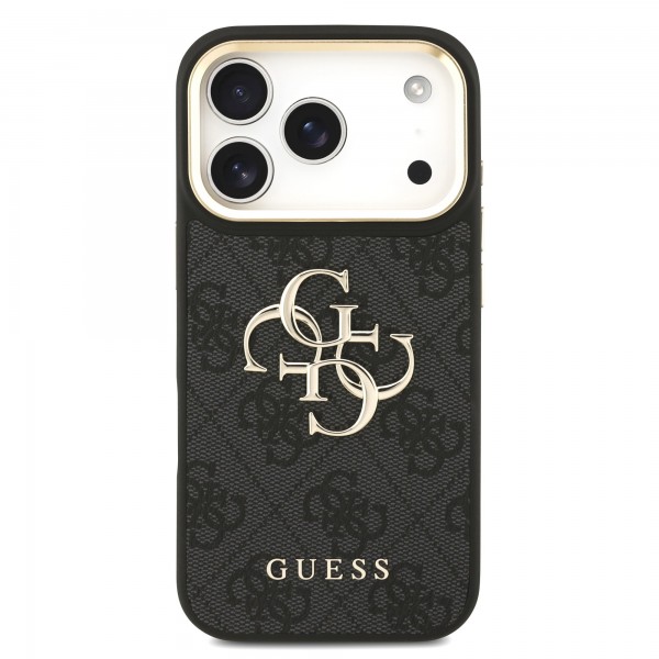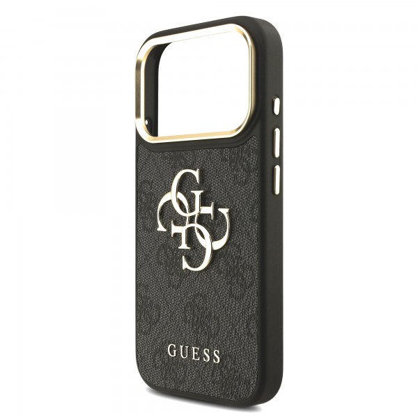 Schnellsuche Guess iPhone 17 Pro Hülle Case Leather 4G Metal Logo Gold Frame Schwarz