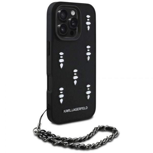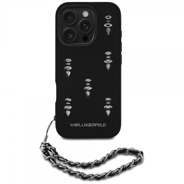 Karl Lagerfeld iPhone 16 Pro Hülle Case Saffiano Crystals Chain Schwarz