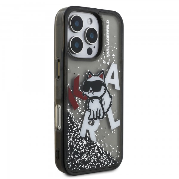 Karl Lagerfeld iPhone 16 Pro Max Hülle Case Liquid Glitter Scattered Choupette Schwarz