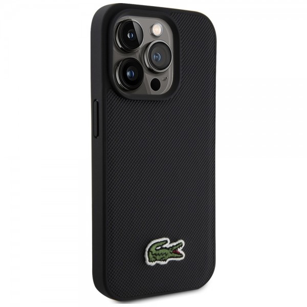 Lacoste iPhone 15 Pro Max Hülle Case Iconic Petit Pique Crossbody Cord MagSafe Schwarz. Die Kollektion ziert das ikonische Krokodilmotiv, das den Geist der Marke Lacoste perfekt widerspiegelt und Eleganz mit sportlichem Stil verbindet.