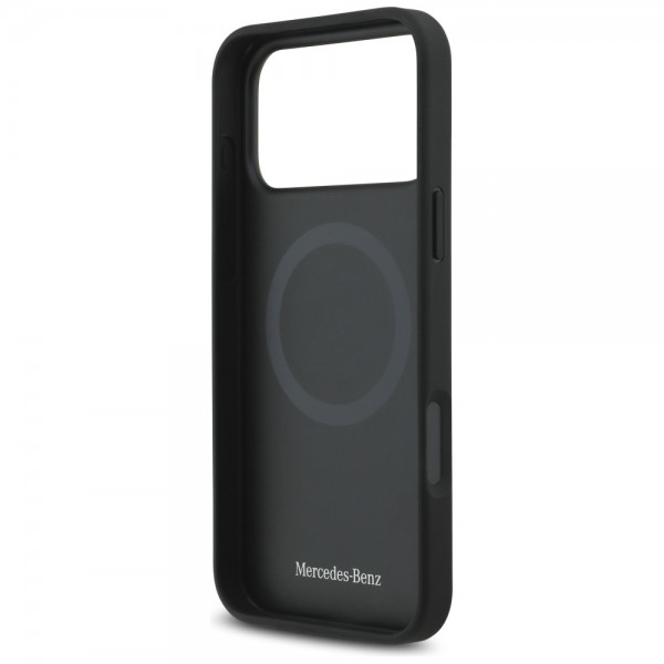 Mercedes iPhone 17 Pro Max Hülle Case Echtleder Laurel Leaves Stripes MagSafe Schwarz. Stilvoller Look. Die Schutzhülle dieser Kollektion vereinen Luxus, Funktionalität und moderne Technologie. Sie bestehen aus echtem Leder mit matter Oberfläche, verziert mit einem dezenten Blattmuster und dem Mercedes-Benz Markenlogo.