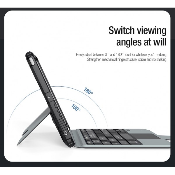 Nillkin iPad 10.2 2019 / 2020 / 2021 Tablet Tasche Tastatur Book Case Backlit. Das Nillkin Bumper Combo Keyboard Case ist eine vielseitige Schutzhülle für Ihr Tablet mit hintergrundbeleuchteter Tastatur, einem Steckplatz für den Apple Pencil mit automatischer Ladefunktion und stufenlos verstellbarem Tablet-Winkel.